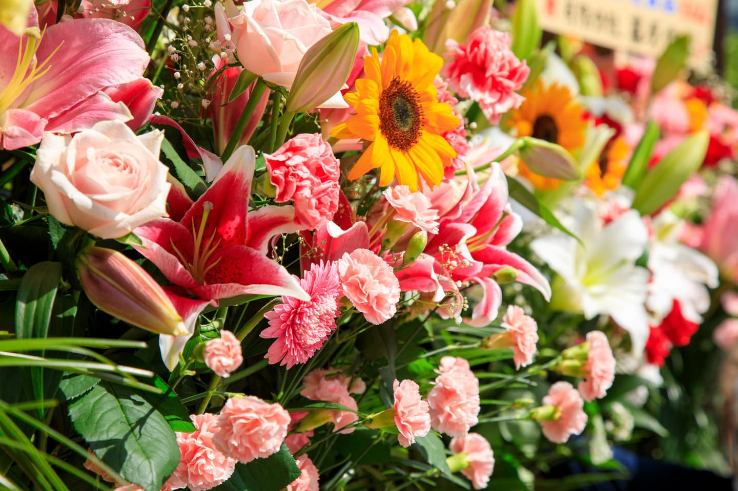 花束(ブーケ)とアレンジメント(かご花)で迷われる場合は、お渡しされた後のことを思い浮かべてみて、花瓶に入れる必要のある花束が良いのか、そのまま飾れるアレンジメントが良いのかを選ばれてください。わからないときはご相談ください。