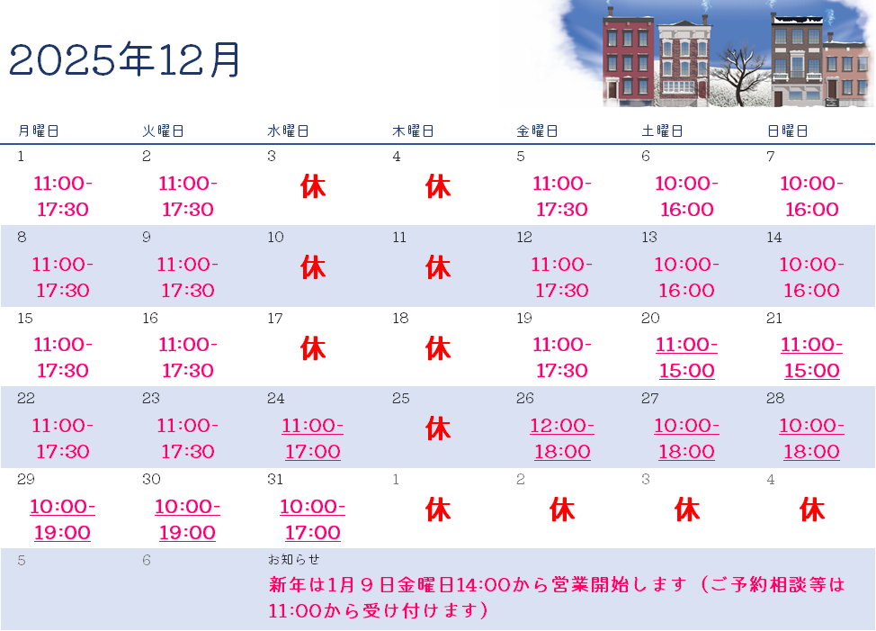 水・木曜日(祝日は営業し振替休日)※年末/母の日前等繁忙期は営業します。