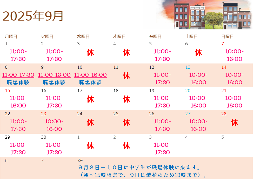 装花業務および定期契約が優先です。臨時装花業務が入った場合は平日休日問わず店舗お休みまたは営業短縮いたします。